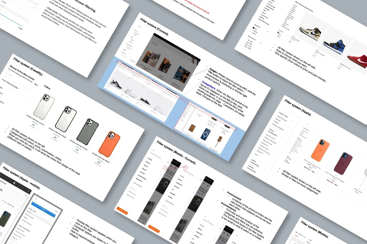 We conducted a competitive analysis to understand how leading brands implement filter systems and product categorization on their listing pages. By identifying effective patterns and usability strengths, we gathered insights to inform a more intuitive experience for our platform.